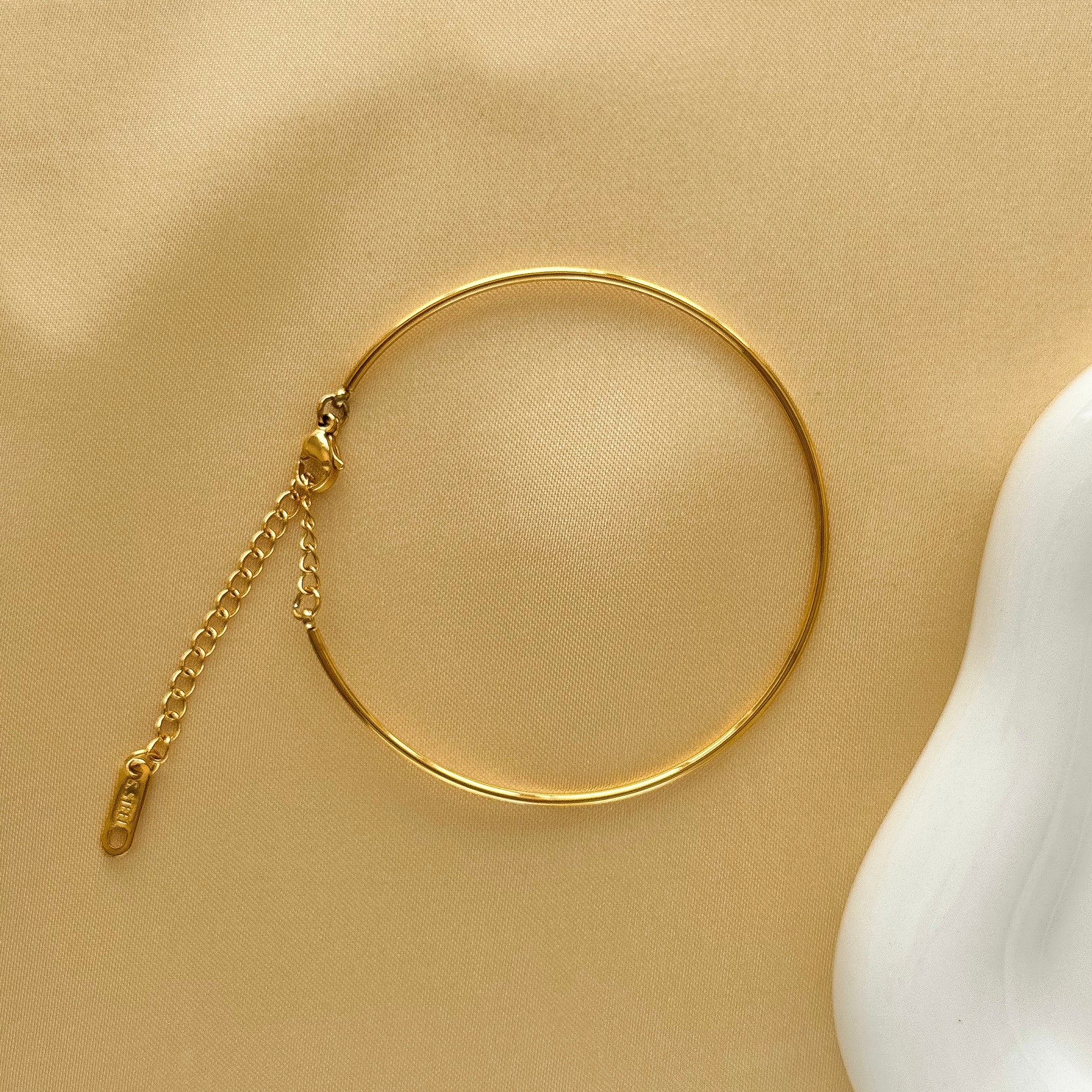 Elevate your everyday style with the Ally Bracelet, a delicate gold band that adds a subtle touch of elegance to any outfit. Its slender design ensures comfort and versatility, making it perfect for layering or wearing alone as a refined statement piece.
