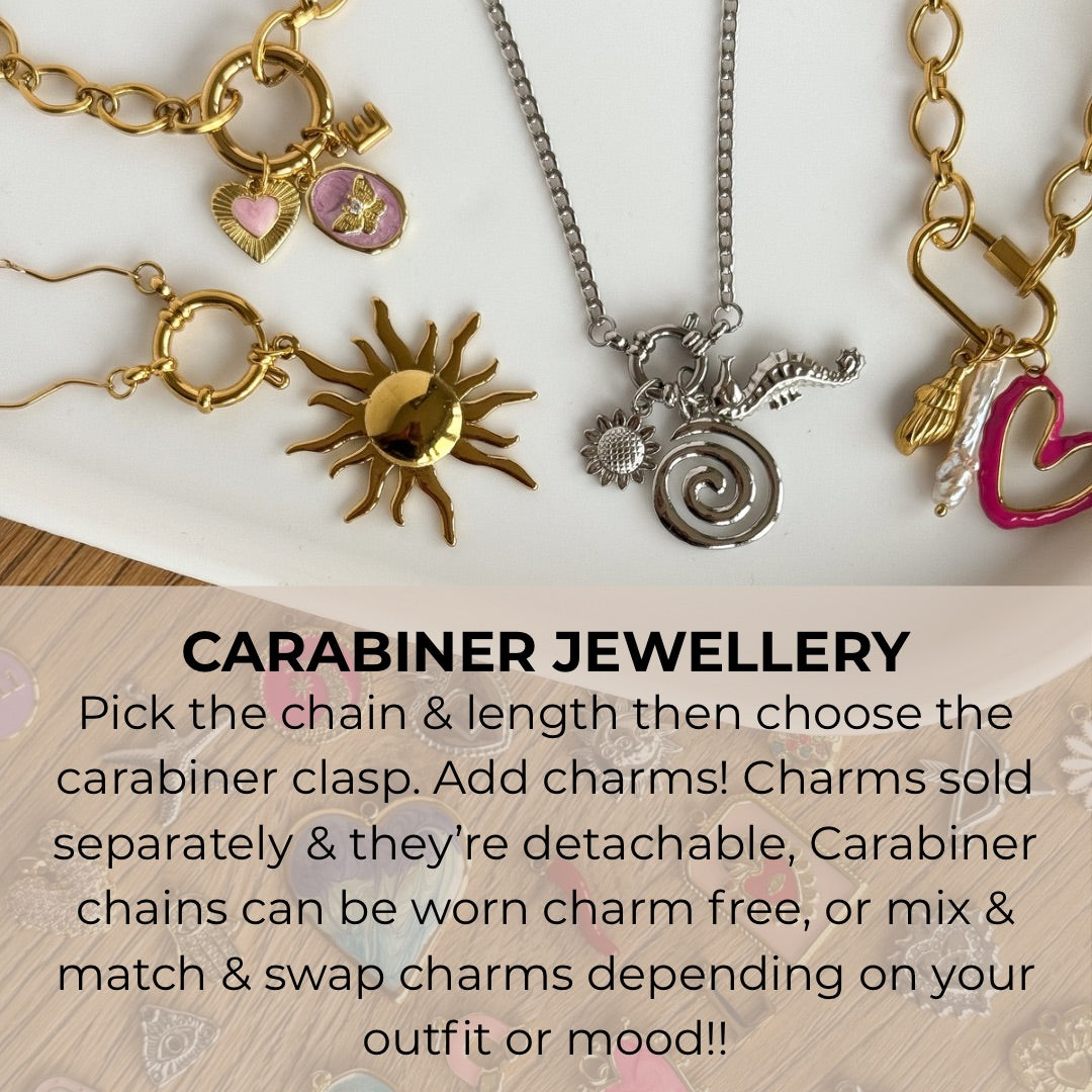 • Charm are detachable, Carabiner chains can be worn charm free, or mix and match and swap your charms depending on your outfit or mood
