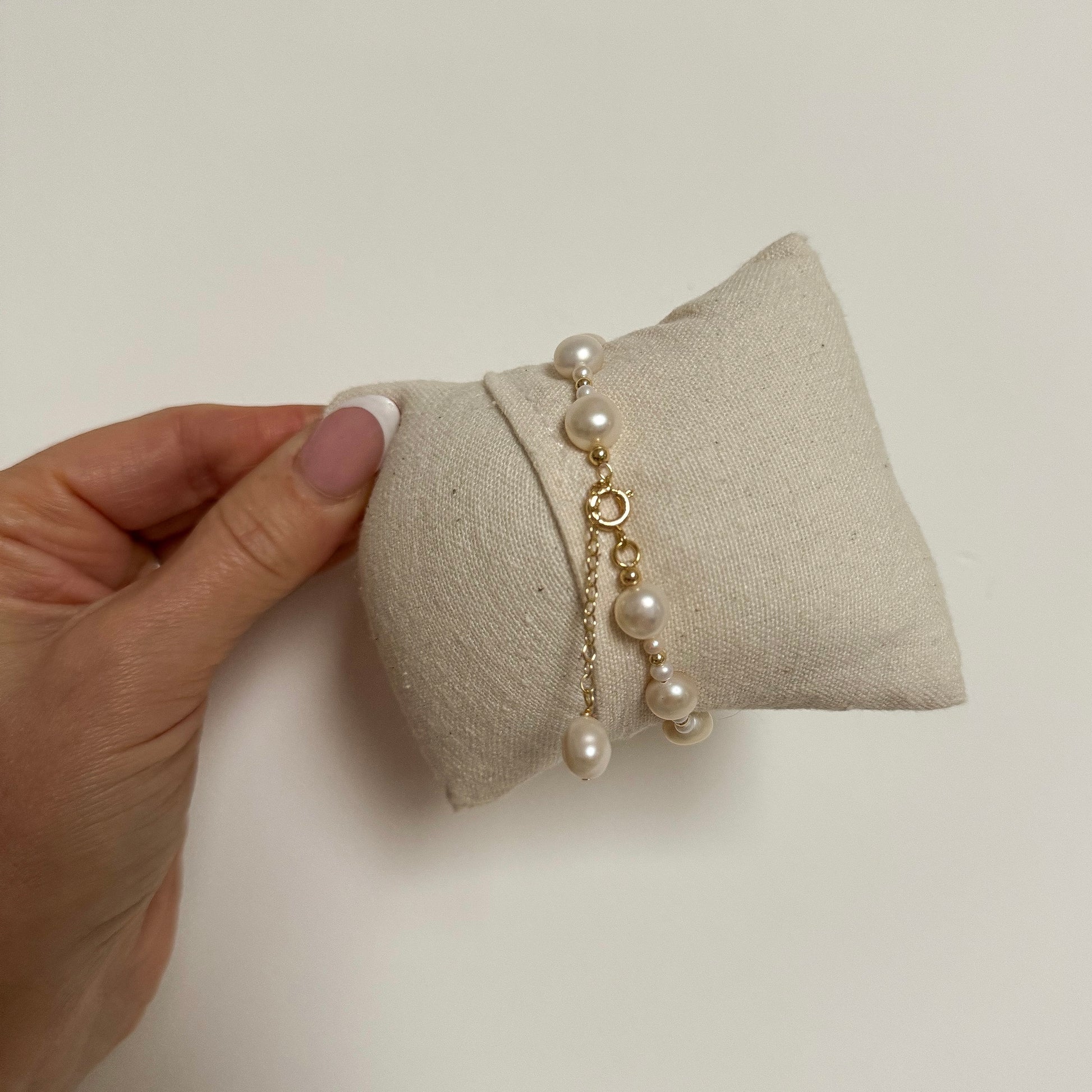 Embrace timeless elegance with the Mae Pearl Bracelet, a stunning baroque-inspired piece that celebrates the beauty of irregular, lustrous pearls. Each pearl's unique shape and natural iridescence create an enchanting play of light on your wrist. The baroque aesthetic brings an air of sophistication and artistic flair to both everyday wear and special occasions.