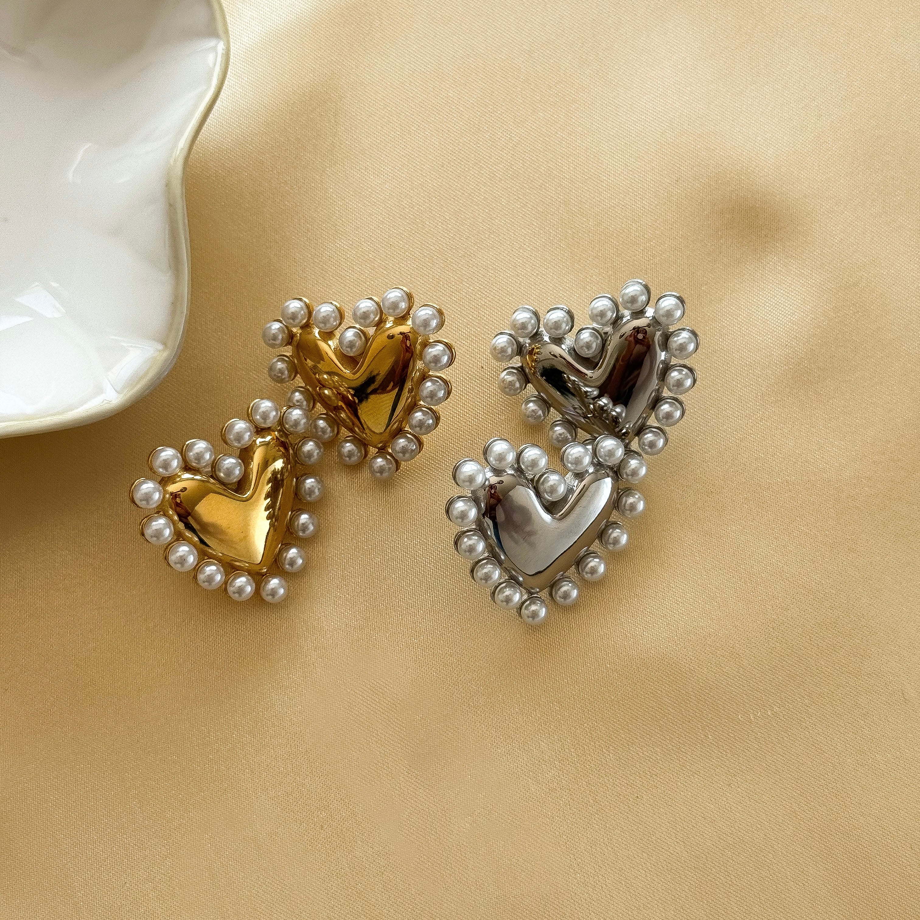 Elevate your style with these stunning Pearl Heart Earrings, featuring a delicate heart shape framed by elegant pearl edge detailing. Available in both gold and silver, they add a timeless touch of sophistication to any outfit.